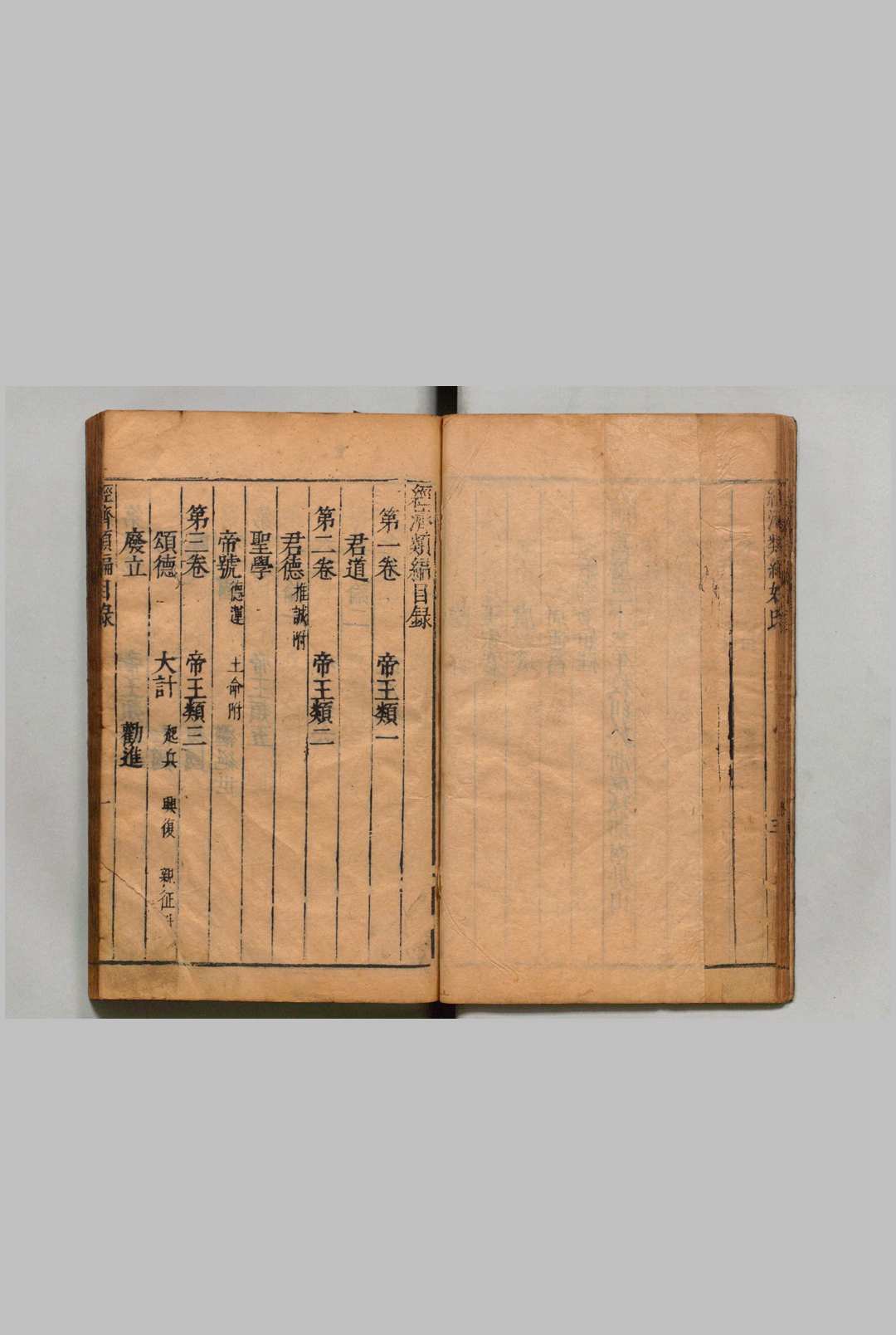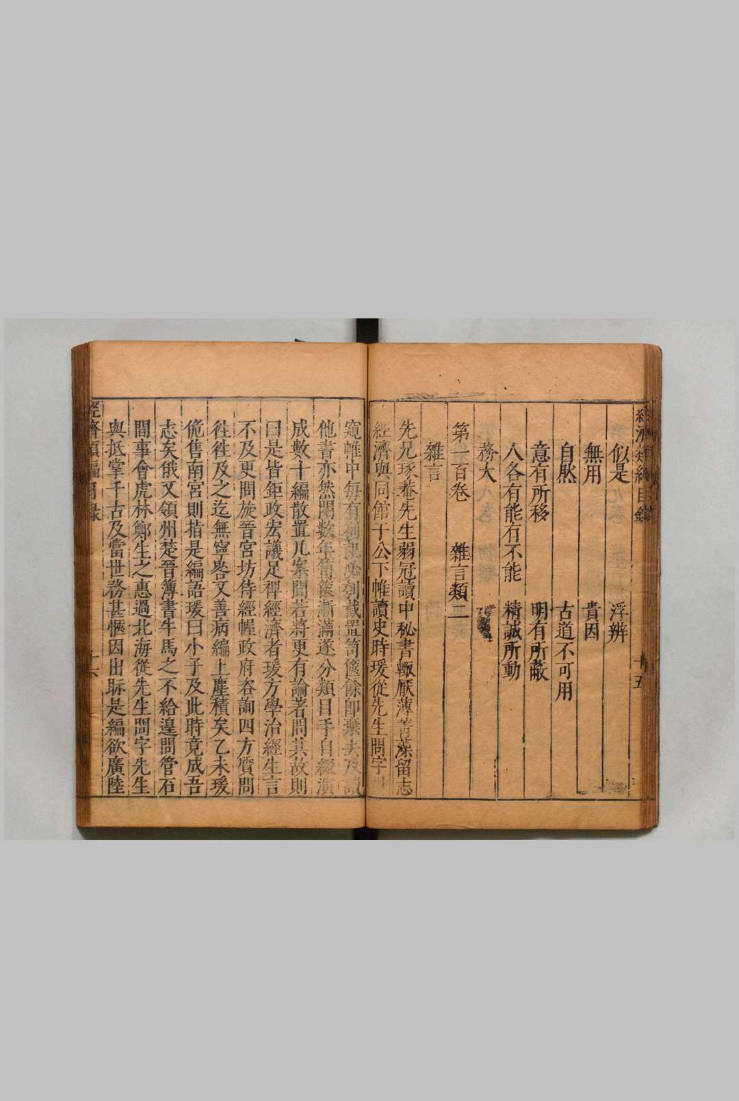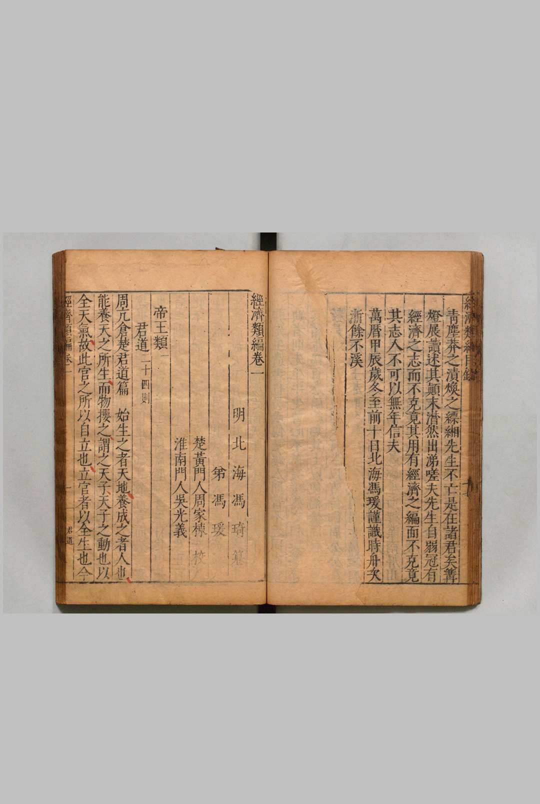 《经济类编》是明代冯琦主持编纂、其弟冯瑗等人整理校订的大型类书。全书共一百卷,按帝王、政治、储宫等二十三大类分目,收录历代典籍中与治国理政相关的内容。该书以”经济”(经世济民)为宗旨,辑录政治军事、财赋礼乐、人伦伦理等领域的文献五千余条。