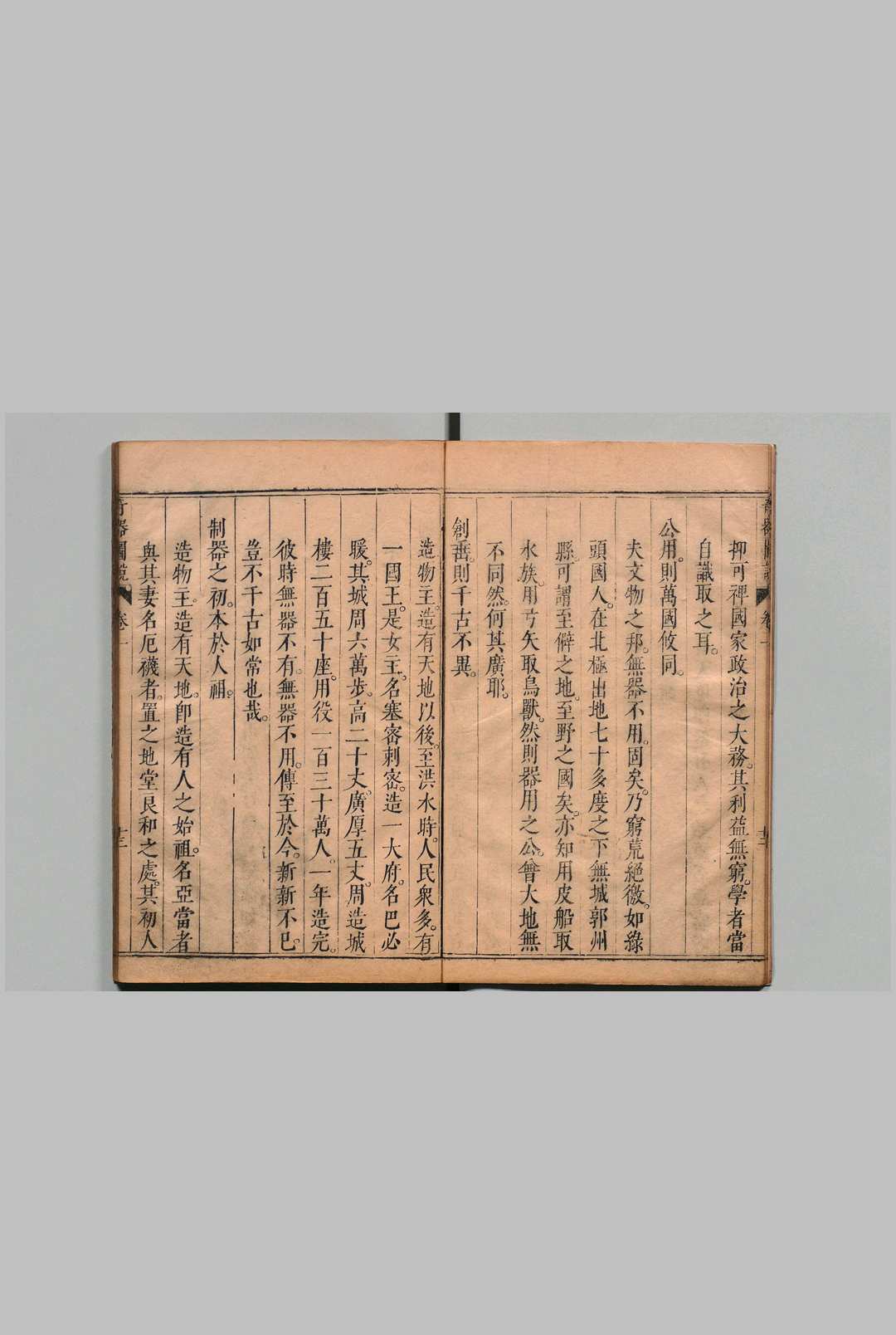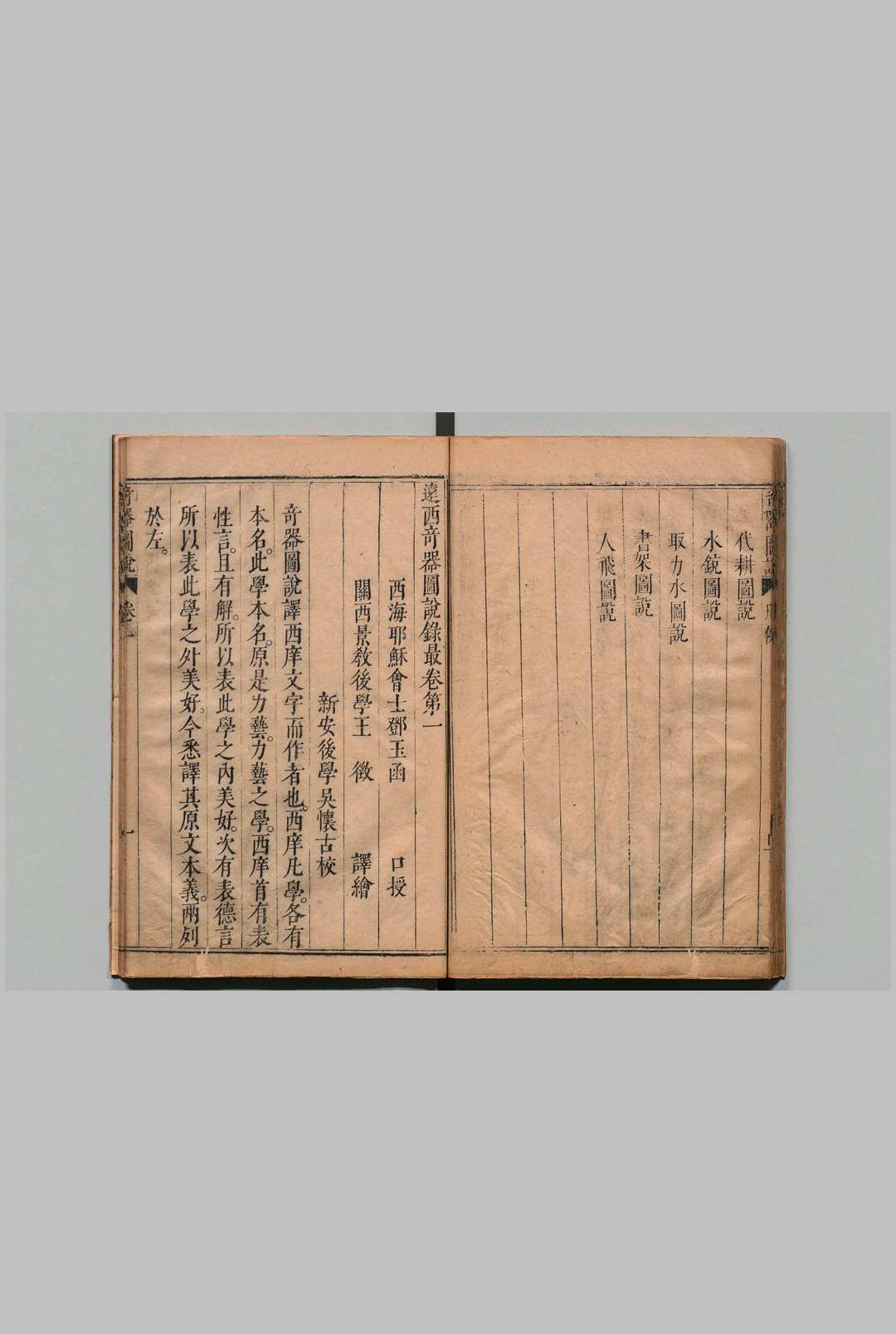 《远西奇器图说录最》于天启七年在北京成书,共分三卷:第一卷叙述力学基本知识与原理,包括地心引力、重心、各种几何图形重心的求法、重心与稳定性的关系、各种物体的比重、浮力等。阿基米得浮力原理也首次被介绍给中国;第二卷为器解,讲述各种简单机械的原理,如天平、杠杆、滑轮、轮盘、螺旋和斜面等;第三卷介绍各种实用机械,共五十四幅图说,包括起重十一图,引重四图,转重二图,取水九图,转磨十五图,解木四图,解石、转碓、书架、水日晷、代耕各一图,水铳四图。