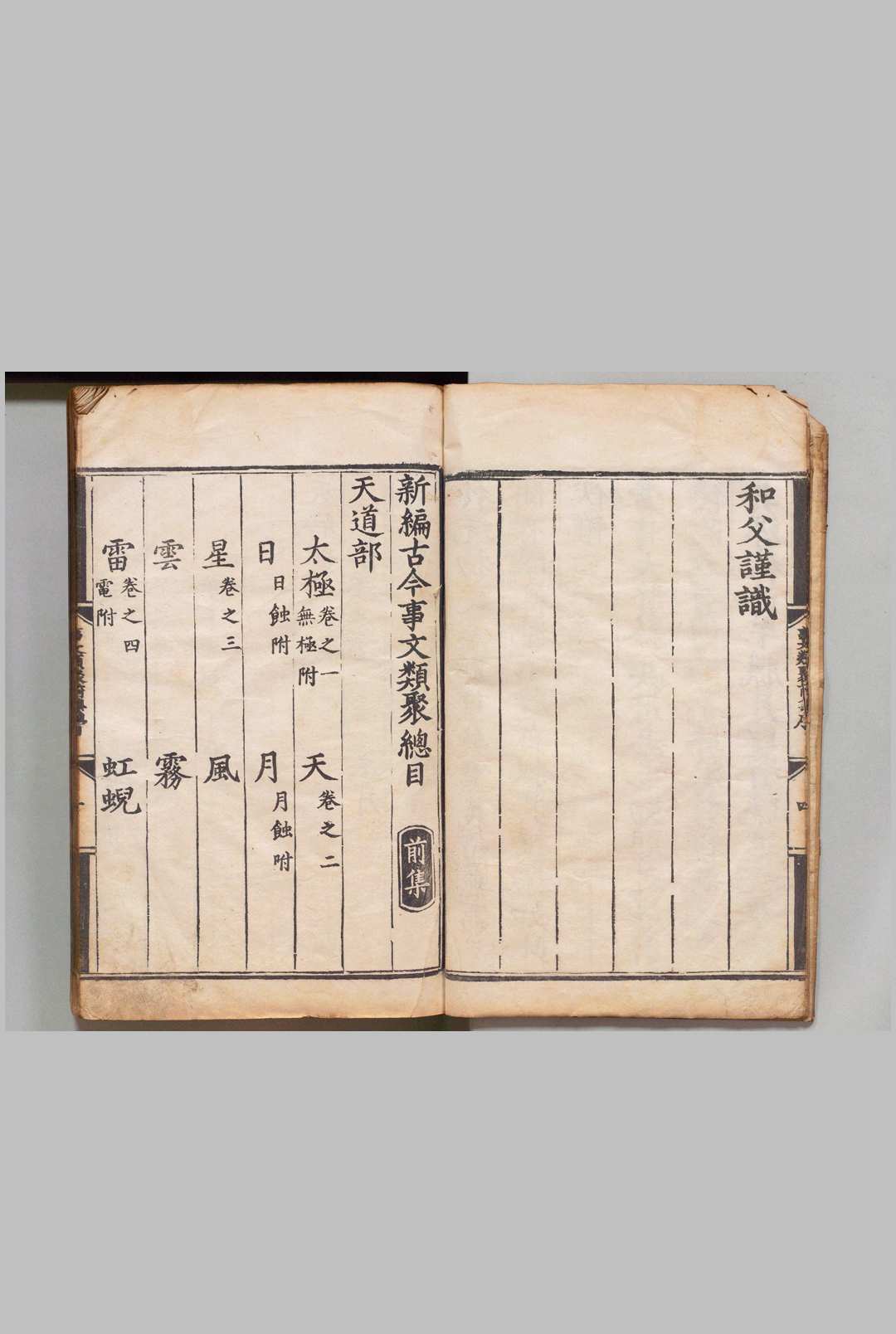 新编古今事文类聚 前集60卷 后集50卷 续集28卷 别集32卷 新集36卷 外集18卷 目6卷 祝穆(宋)富大用(元)刊本 ,明 , 经厂