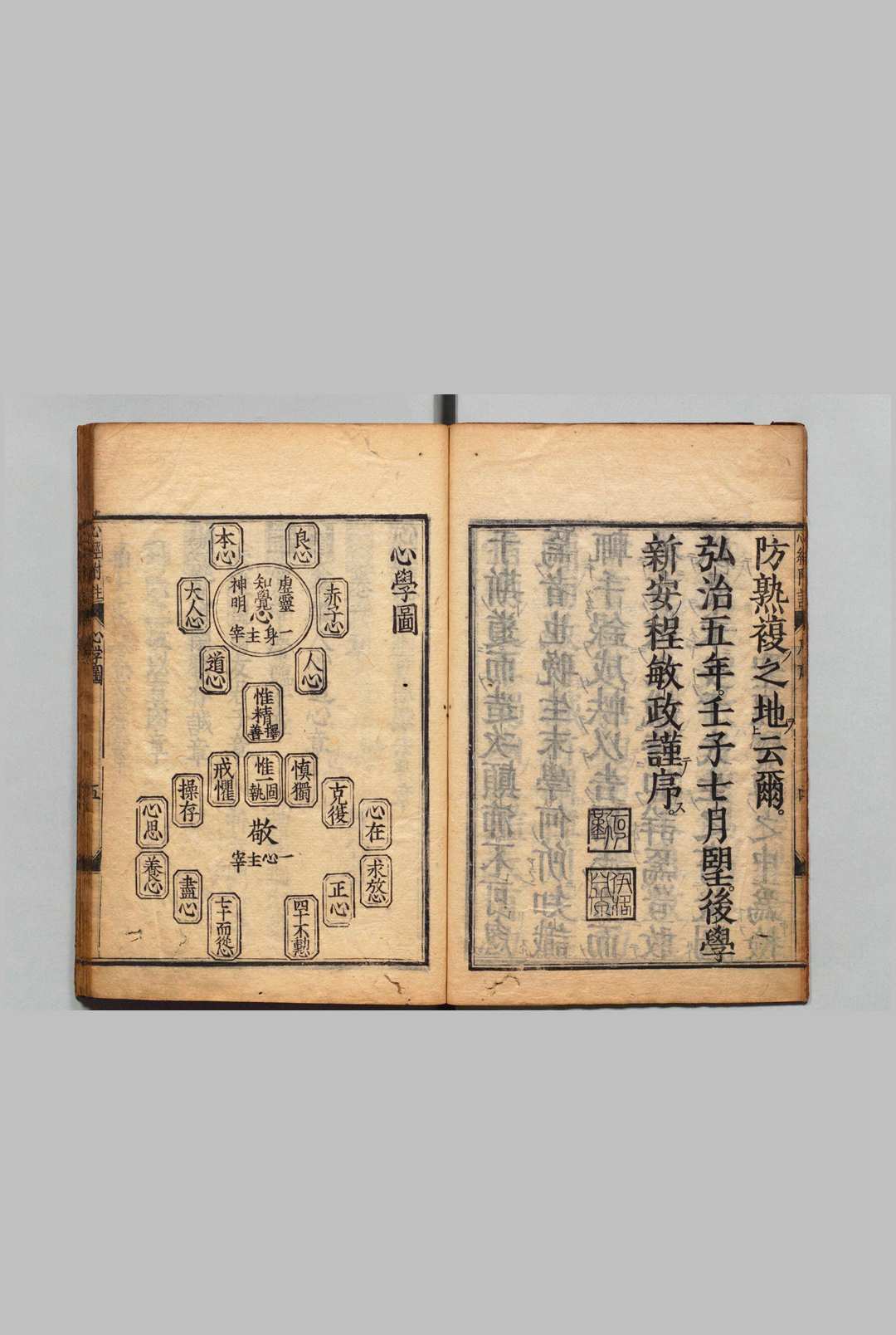 心经附注四卷,(宋)真德秀撰,(明)程敏政注,明弘治五年(1492年)程敏政刻本。半页十三行二十三字,小字双行同,黑口,四周双边。缮写:汪道全、程敏亨、程坛、夏廷章、汪范,刻字:仇以忠、仇以淳、仇以茂、仇以才、仇以顺、黄文汉、黄文通、黄永升、黄永旻。卷前有弘治五年程敏政序,卷末有弘治五年汪祚後序、程敏政後序。