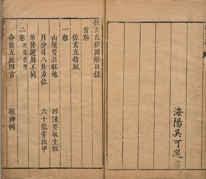 风水古籍《佐玄直指图解》页数: 133双页266页 简介:《管氏地理指蒙》明天启七年刊本 ,堪舆风水相关古籍。佐玄直指图解》除增加若干选择神煞外,还增加了少量修报趋避等内容,其中五气金精图,金乌星等章,五般会杀,或明五气,或论太阳月亮,或言五行,均与天星,阴阳二气及五行生克相合,实为选择学(择吉)中论述最为完善之一。