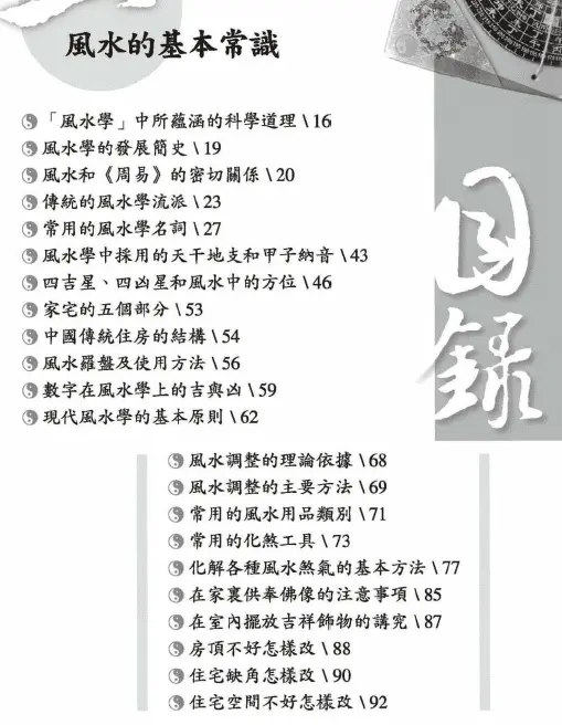 《风水的常识与应用》本书从风水的角度,图文并茂地介绍了风水在当代主要是家装中的应用,有着很好的易读性和实用性。