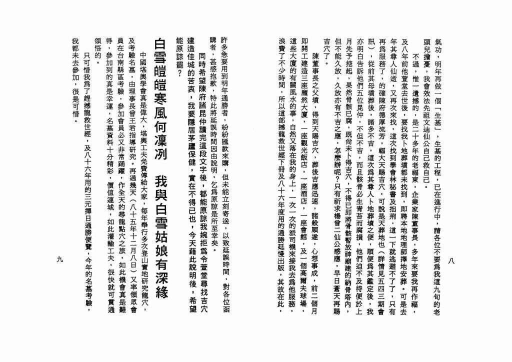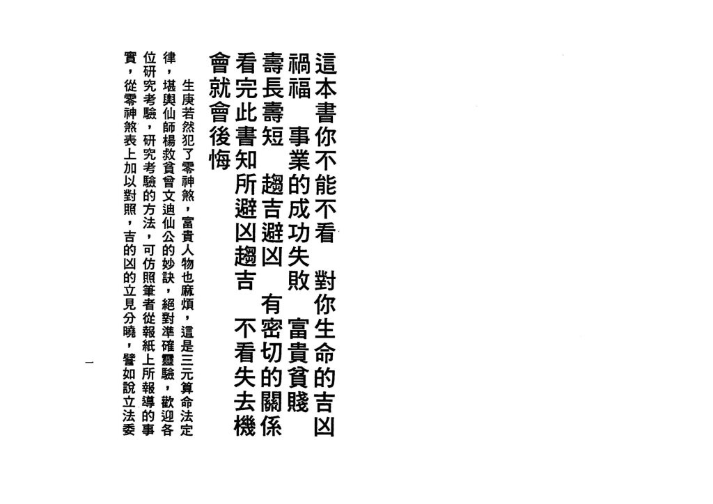 详细介绍:生庚若然犯了零神煞,富贵人物也麻烦,这是三元算命法定律,堪舆仙师杨救贫曾文迪公的妙诀,绝对准确灵验,欢迎各位研究考验,研究考验的方法,可仿照笔者从报纸上所报导的事实,从零煞表上加以对照,吉的凶的立见分晓,譬如说立法委员改选,县市长改选名单上的姓名年岁,又如这次内阁改选所发表的姓名年岁,吉的几人,凶的几人,将来的结果又如何,就可得出结论的,又如近来所发生的事故,小人物不胜枚举,大人物如前及本书中的许多实例,都是一流的上乘资料,快去研究验罢!