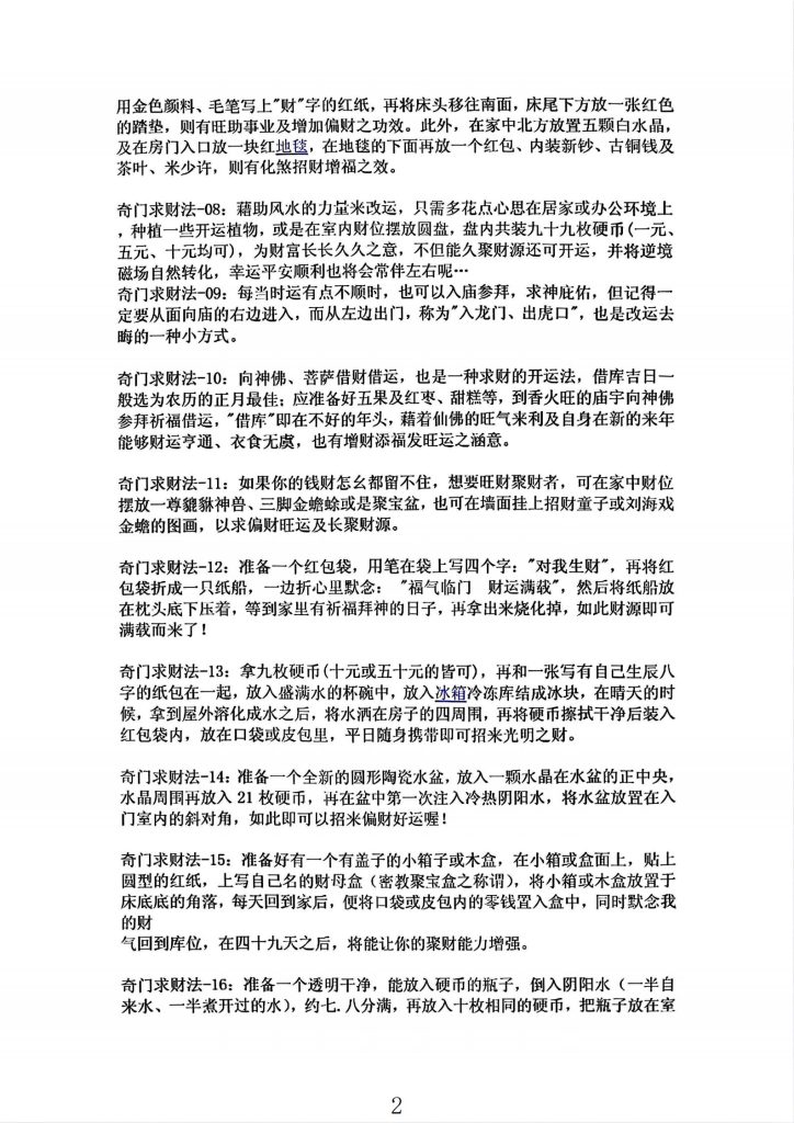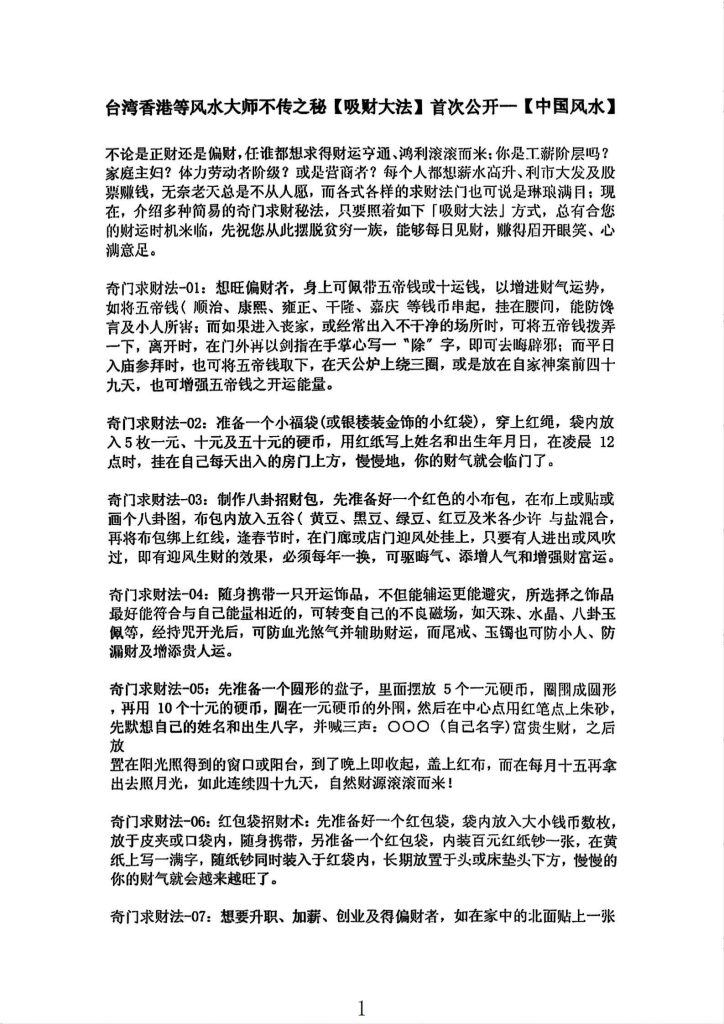 不论是正财还是偏财,任谁都想求得财运亨通、鴻利滚滚而来:你是I..薪阶层吗? 家庭主妇?体力劳动者阶级?或是营商者?每个人都想薪水高升、利市大发及股 票赚钱,无奈老天总是不从人愿,而务式各样的求财法门也可说是琳琅满目;现 在,介绍多种简易的奇门求财秘法,只要照着如下「吸财大法」方式,总有合您 的财运时机来临,先祝您从此摆脱贫穷一族,能够每II见财,嫌得眉开眼笑、心 满意足。