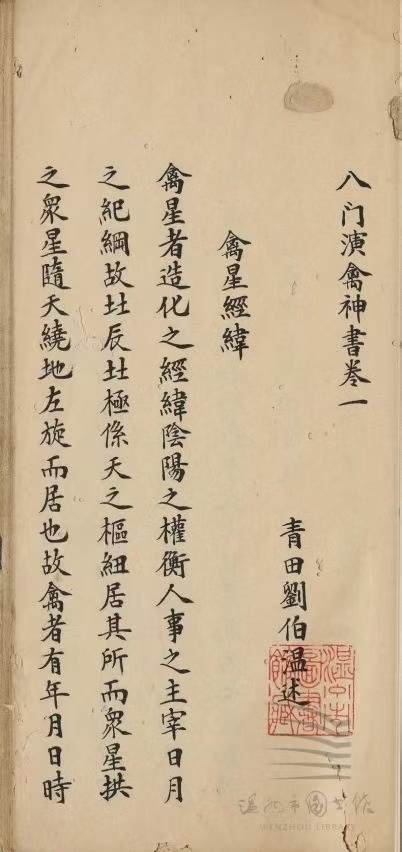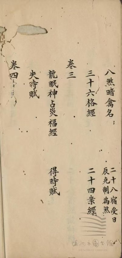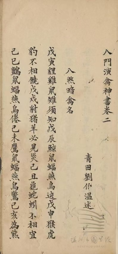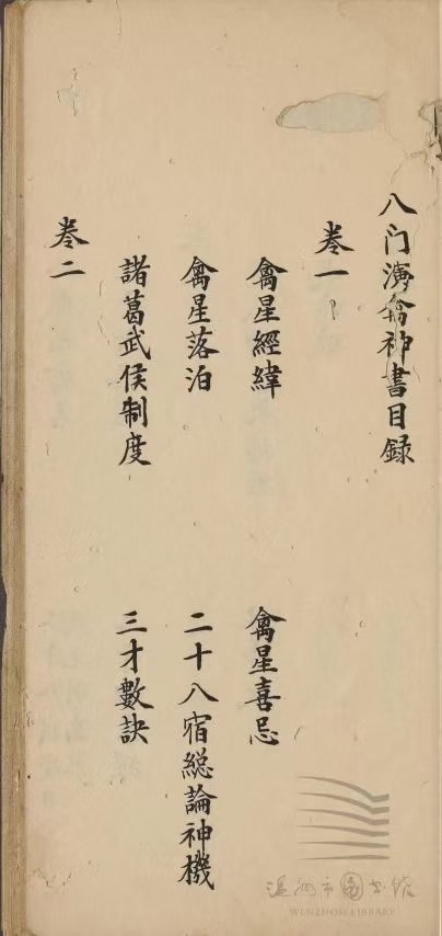 简介:《八门演禽神书》清抄本,奇门演禽相关古籍。此书为残本,共8卷只存卷一卷二部分内容,内容包含:刘青田演禽序,八门演禽序,三才数序,禽星经纬,禽星喜忌,禽星落泊,二十八宿总论神数,诸葛武侯制度,三才数诀,八煞暗禽名,二十八宿受日辰克制为煞,三十六格经,二十四案经。