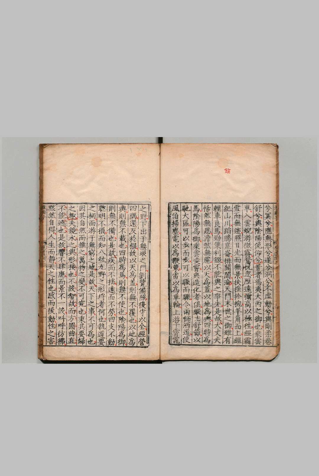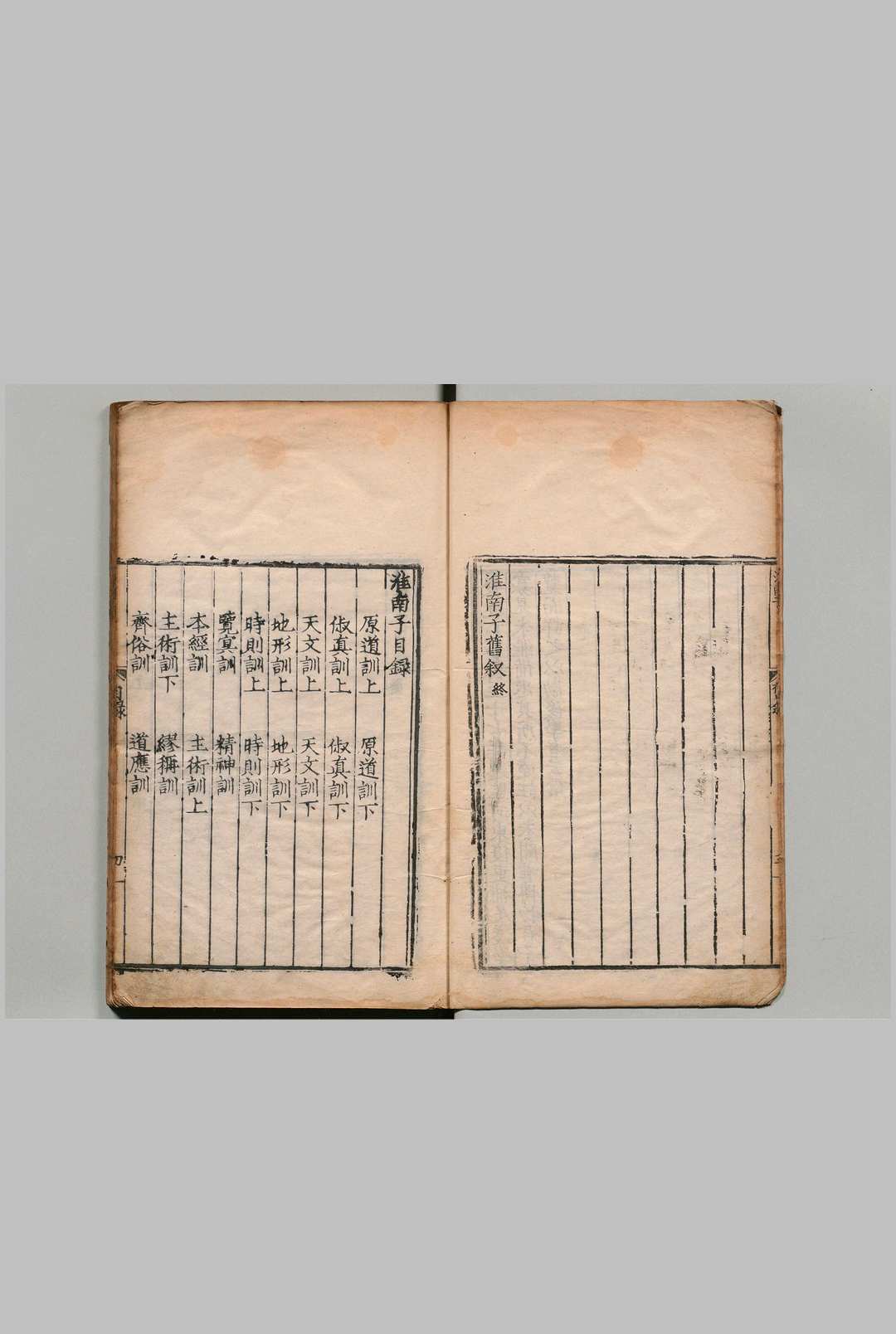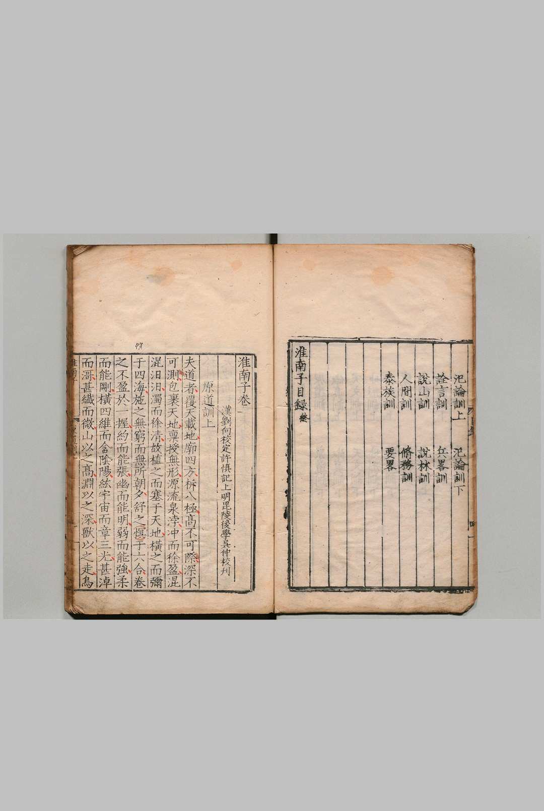 《淮南子》始纂于景帝时,由刘安集众门客编成[,建元二年献于武帝。该书以道家思想为主,融合儒、墨、名、法、阴阳等诸家学说,自成体系。原有内篇21、外篇33,内篇论道,外篇杂说,现仅内篇存世。全书各篇按天、地、人顺序贯穿,每篇一个主题:末篇《要略》为序言,总叙各篇要旨;《原道》《俶真》为纲领,阐述“道”之起源、特征及其普遍性;《天文》《地形》《时则》论述天地四时及宇宙构造;《览冥》《精神》阐释宇宙法则如何与人之精神、本质相通;《本经》至《氾论》讨论政治、伦理和社会秩序;;《诠言》至《修务》则论述军事、哲理、个人修养等人间万事;[第二十篇《泰族》与《原道》呼应,以“天、地、人一体感应”之理总结并构筑全书体系。