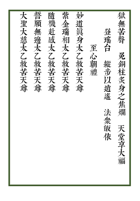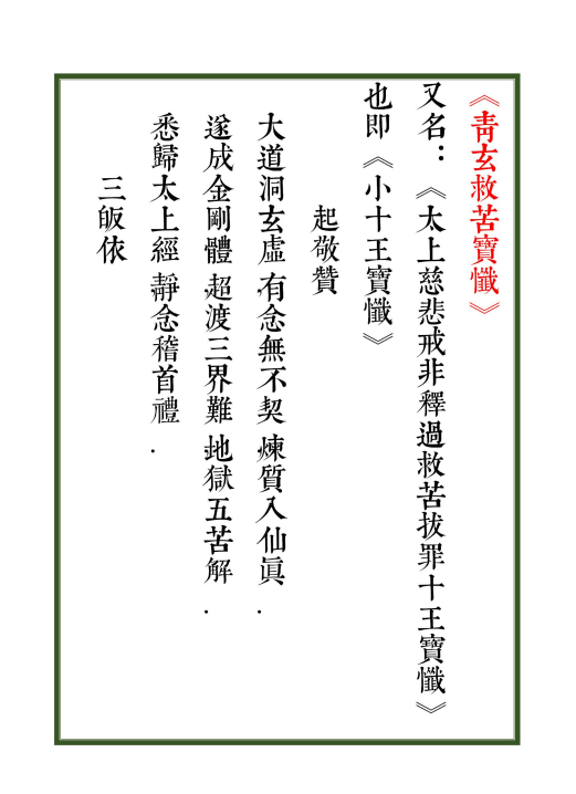 简介:《青玄救苦宝忏 十王疏文》又名《太上慈悲戒非释过救苦拔罪十王宝忏》 《小十王宝忏》道家科仪相关古籍,精排版。
