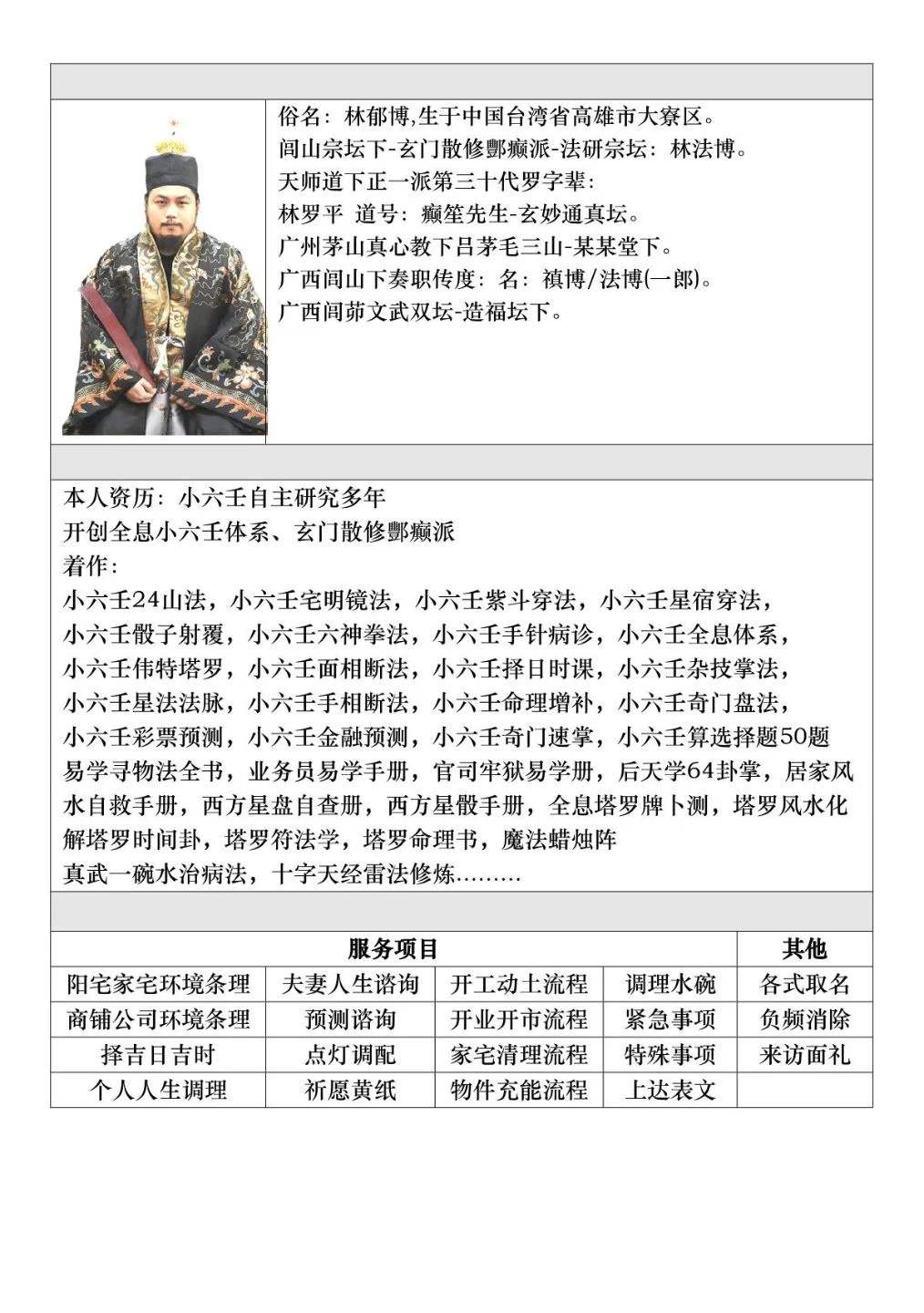 简介:《小六壬六宫四柱命盘法》林法博,民间玄门散修酆癫派命术壹点壹册,六壬相关书籍。小六壬六宫四柱命盘法是一种结合小六壬、六宫神煞与四柱命理的综合命理体系,常见于民间玄门命术相关资料中。