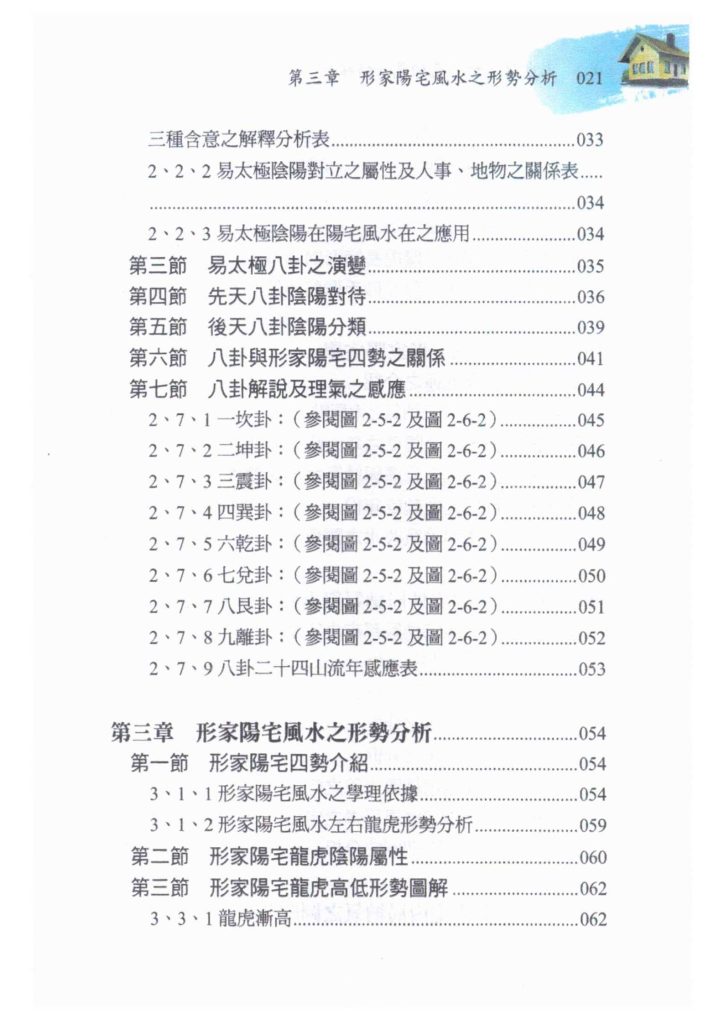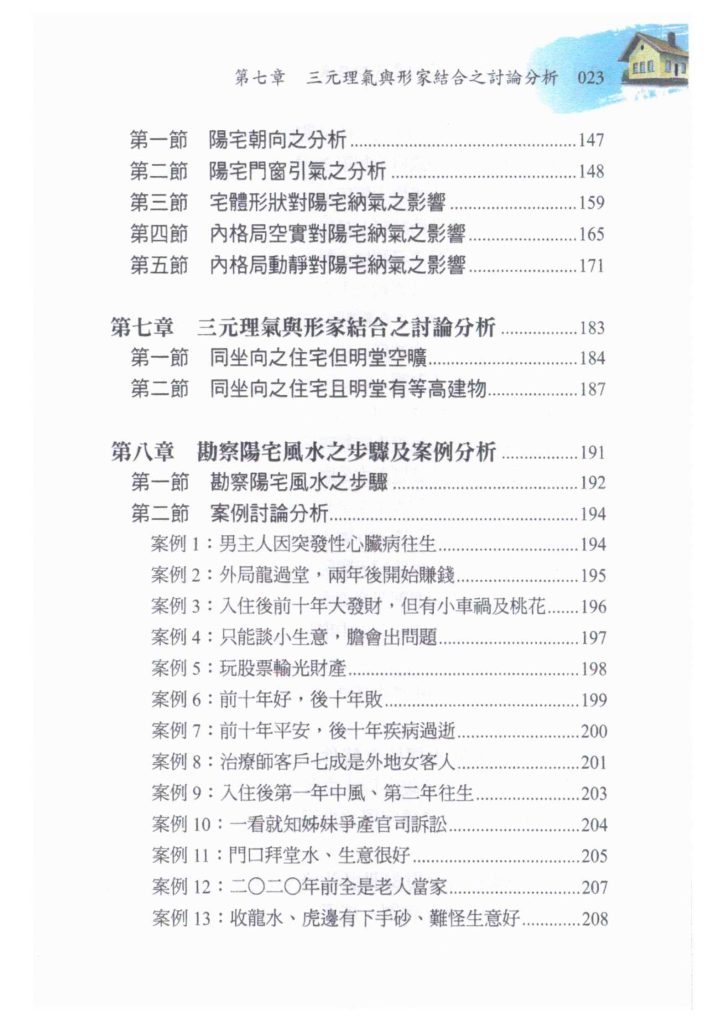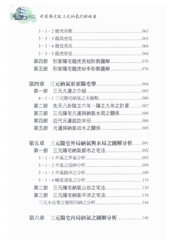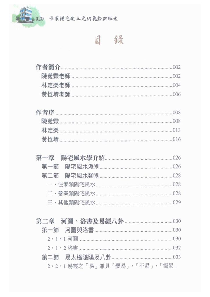 本书共有十大章节,从阳宅风水学派别谈起,认识河图、洛书及易经八卦,再到形家阳宅风水之形势分析,再谈三元纳气与形家阳宅差别,如何判断三元阳宅【外局纳气与水局】,三元阳宅【内局纳气】,接著用三元理气与形家结合之讨论分析,归类勘察阳宅风水之步骤及案例分析,当然也要著重阳宅风水择地之条件以及阳宅风水规划设计注意事项都必需面面具到都要考虑到,这样才是一本好书。