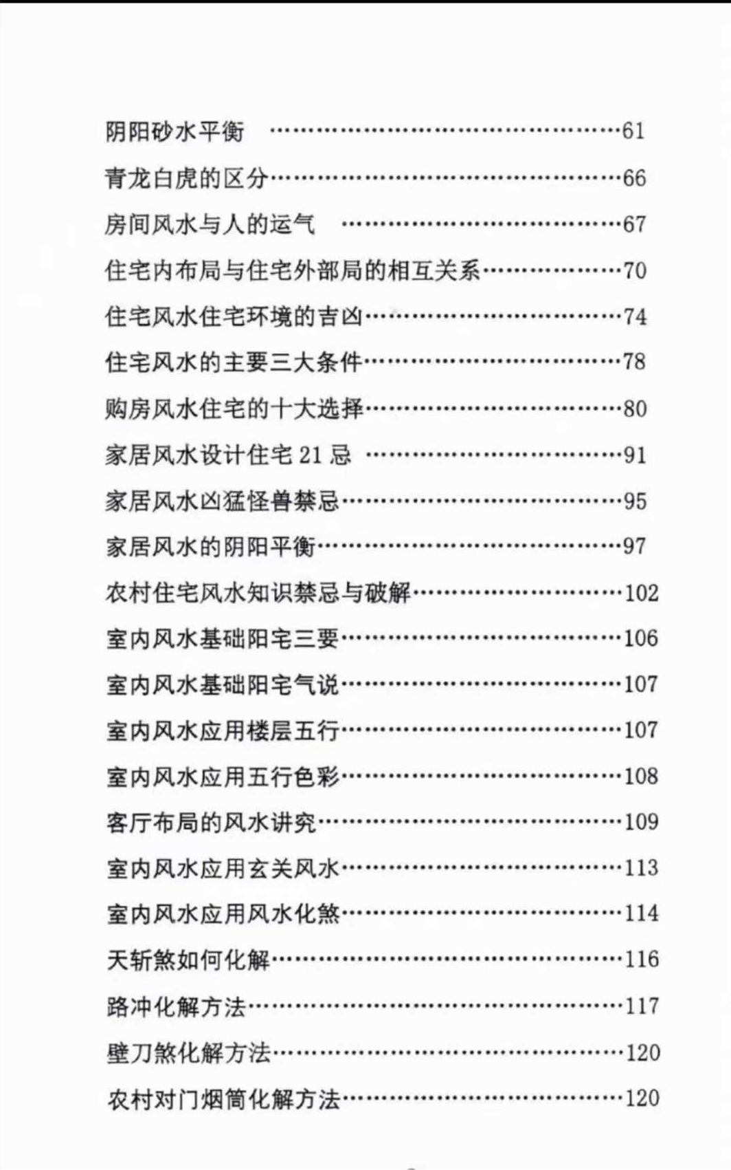 住宅风水:房间风水与人的运气、住宅内布局与住宅外部局的相互关系、住宅风水住宅环境的吉凶、住宅风水的主要三大条件、购房风水住宅的十大选择、家居风水设计住宅 21 忌、家居风水凶猛怪兽禁忌、家居风水的阴阳平衡、农村住宅风水知识禁忌与破解