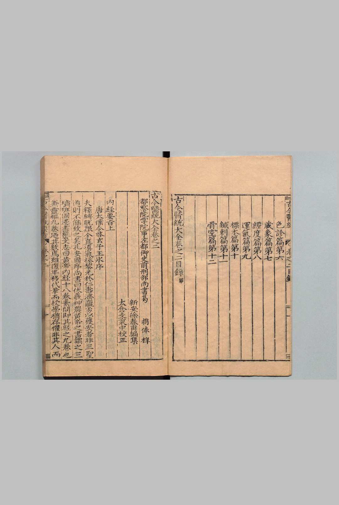 《古今医统大全》又名《医统大全》,系医学全书,徐春甫撰。书成于嘉靖三十五年(1556),次年刊行。以后的版本有隆庆四年(1570)本、嘉庆间刻本等。