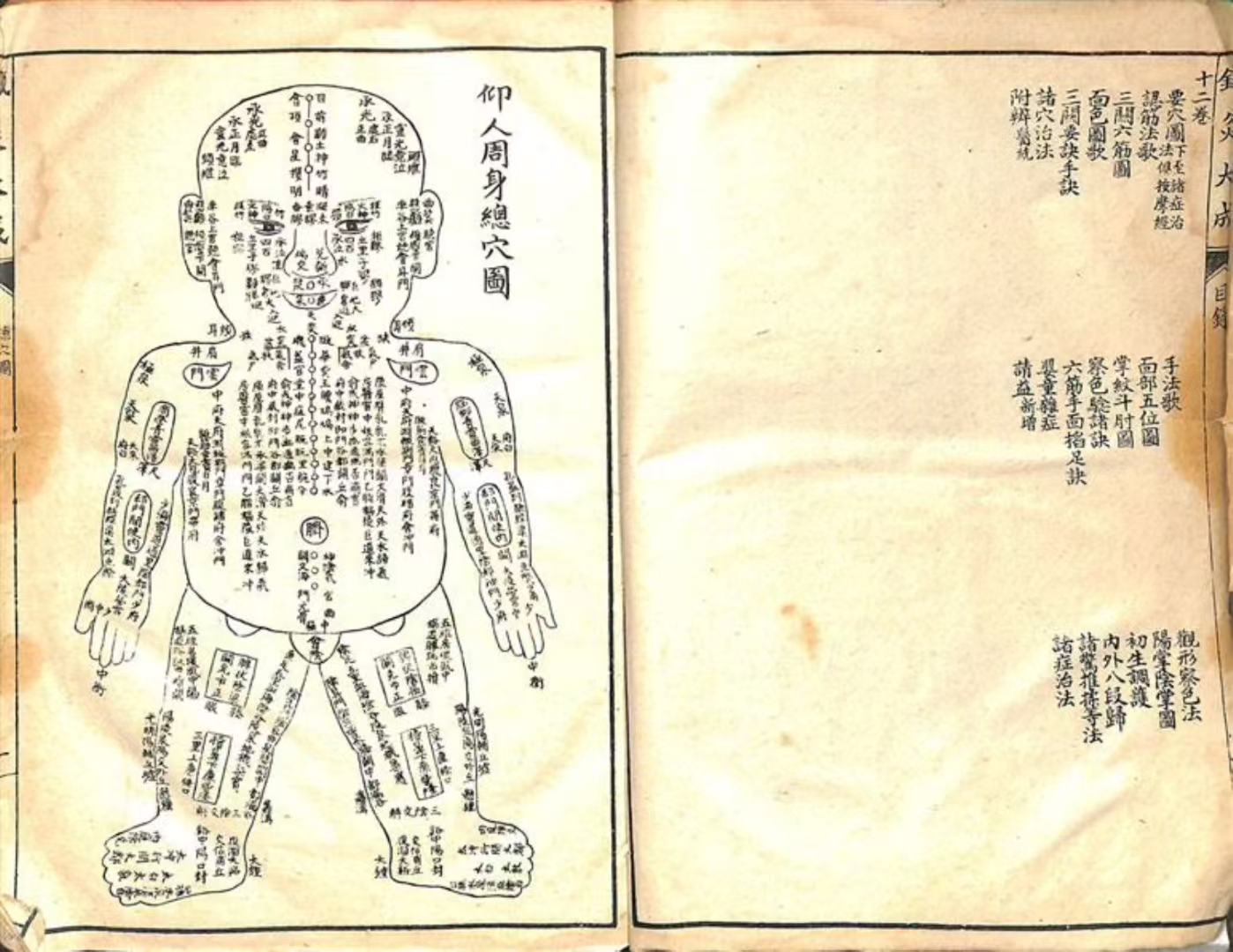 简介:《针灸大成》中医针灸相关古籍,共12卷本,民国石印附人体穴位图两张(图模糊) 原函12卷。