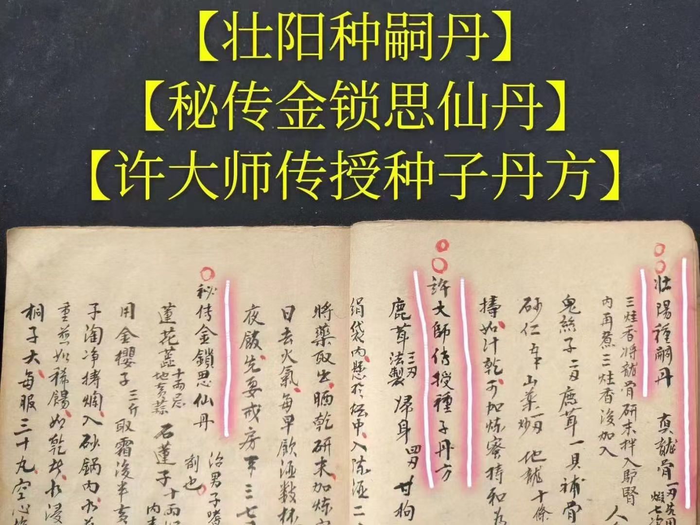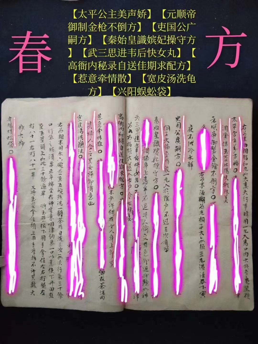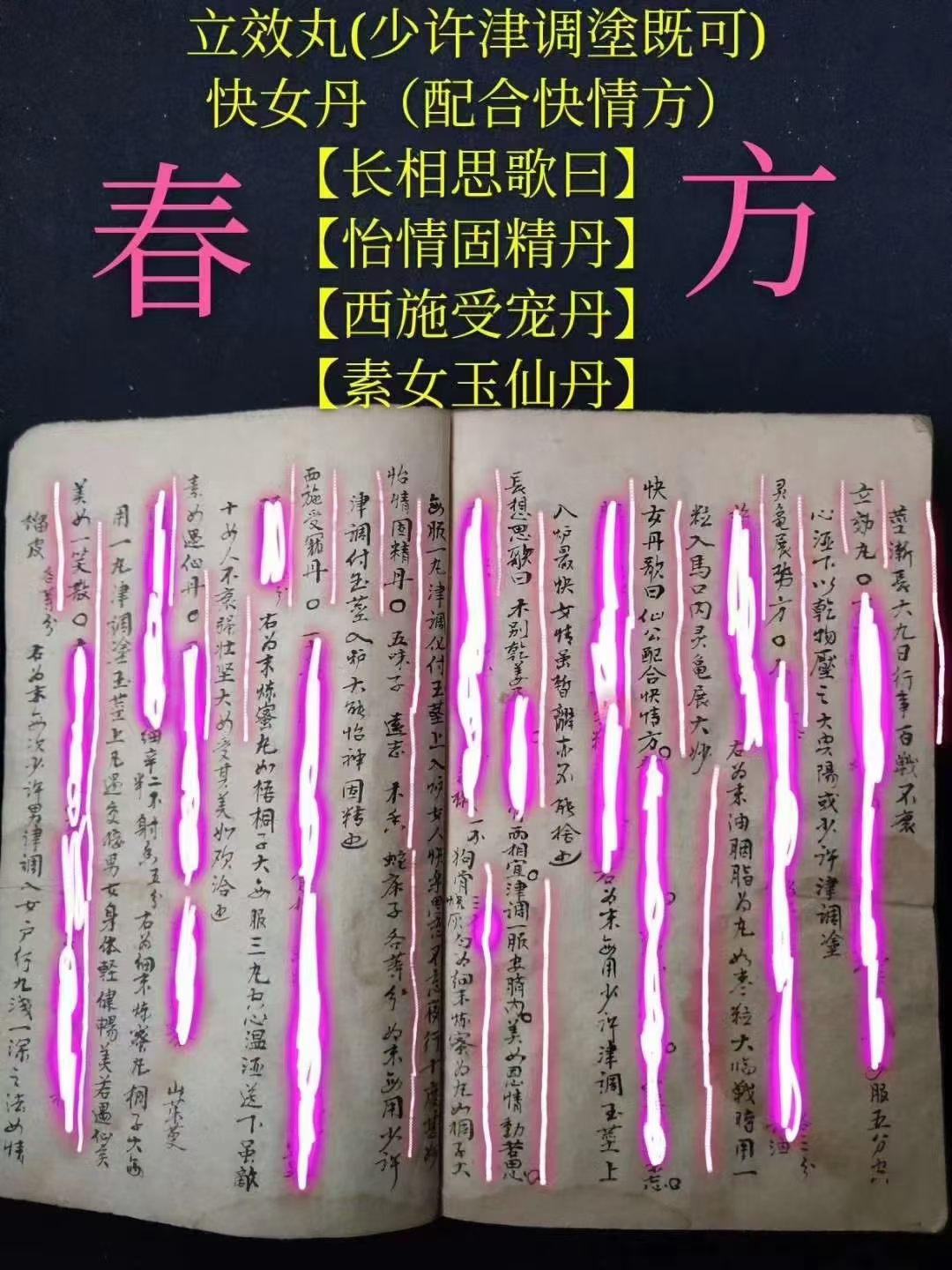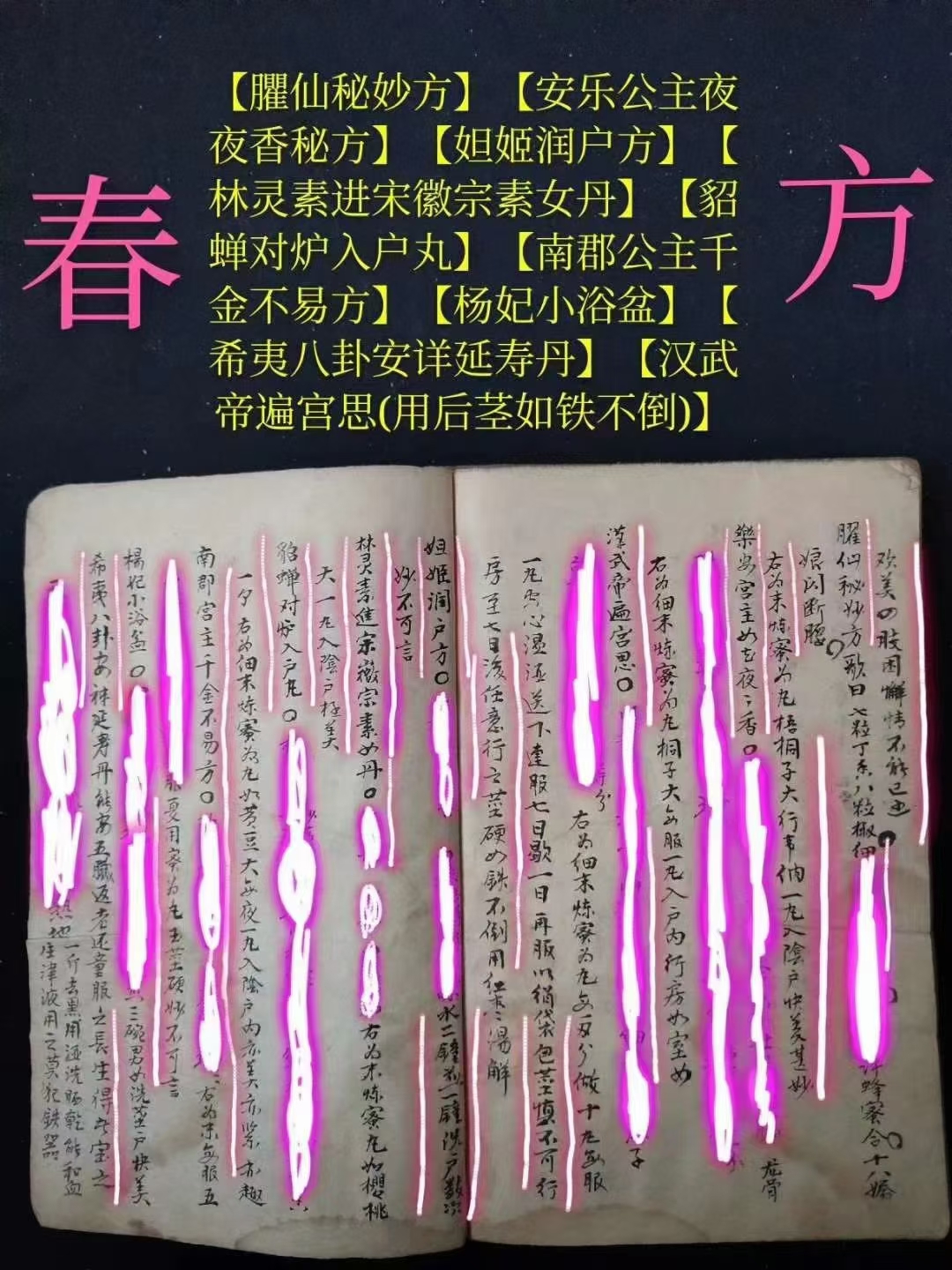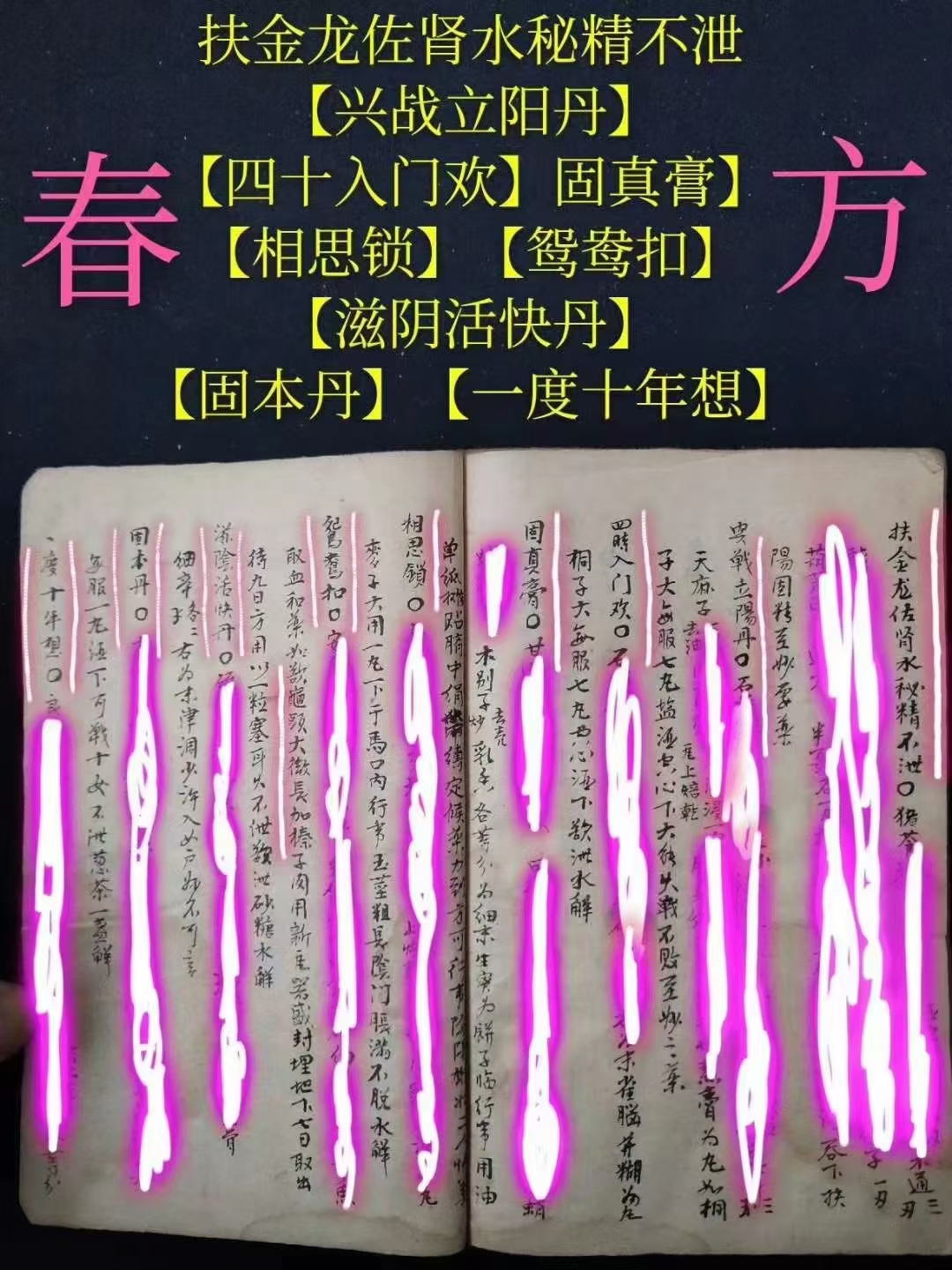 简介:《春方房中妙诀》【春方文献】(以古代皇帝命名的春方)《种子方妇人科》(罕见孤本)【此是房中妙药,春方配合若遇仙】【春方药性歌】【助阳丹歌】(药效最强大秘方)【臞仙秘妙方】【安乐公主夜夜香秘方】【妲姬润户方】【林灵素进宋徽宗素女丹】【貂蝉对炉入户丸】【南郡公主千金不易方】【杨妃小浴盆】【希夷八卦安详延寿丹】【汉武帝遍宫思(用后茎如铁不倒)】【历代仙圣集古效验方(夜有房事劳神明早服此大有神补)】【週天生精再造固本还真膏(种子、射入子宫,百发百中)】【立效丸(少许津调塗既可)】【快女丹(配合快情方)】【长相思歌曰】【怡情固精丹】【西施受宠丹】【素女玉仙丹】【鱼水相投散】【强龟益女丹】【乐安公主热炉方】【热炉双妙丹】【双妙丹配方】【贴脐膏配方】【窄阴方配方】【四吋双美散配方】【铁钓丸配方】【金枪不倒方】【揭被春方】【飞燕喜春散方】【连理枝方】【宋徽宗戏珠方】【秦宫朱后浴盆双妙丹】【太平公主美声娇】【元顺帝御制金枪不倒方】【吏国公广嗣方】【秦始皇識嫔妃操守方】【武三思进韦后快女丸】【高衙内秘录自送佳期求配方】【惹意牵情散】【宽皮汤洗龟方】【兴阳蜈蚣袋】【武则天花心洞房术】【锦帐生春月】【固本壮阳丹】【滋阴壮阳丹】【一度终身想】【一捻丹】【扶金龙佐肾水秘精不泄】【兴战立阳丹】【四十入门欢】【固真膏】【相思锁】【鸳鸯扣】【滋阴活快丹】【固本丹】【一度十年想】【盼子、盼子、久婚夫妻的希望】(专治不孕不育最珍贵医书)(天必予以贤嗣、誇设种子成方)【男子先痿、高精难射远】【再服四剂而气大旺,自然久战可壮阳,浅精可以射远,妇人易其厭心而变为而欢心,男施女受,而玉燕投怀矣,此方妙在补气,而绝不去补阴】【种子之法】【服药三月而精多,且阳物亦坚,安有不种子】【一男子有精力最健,入房最久泄精之吋,如汤浇入死宫,妇人受之,必然吃惊。而反不生育】【服药后可阳春遍体】【服用三月可以久战】【服用一个月见效,但必须坚忍房事,入房自然具大,而且能久战可以取妇人之欢心】【壮阳种嗣丹】【秘传金锁思仙丹】【许大师传授种子丹方】【主治阳痿不举,阳脱之症】【治精寒阳痿无子】【治疗固精健阳,老年无子】【种子方,宁波龙二守传验过】【仙某酒配方,治男子阳痿不举】【补肾种子丹】【延年种子仙丹(吕三传授治男子虚寒,精寒、瘦弱吐血、下血,阳事不衰绝,女子下寒,经事不调,血绷带下,久无嗣息,论老少男女俱可服之,能精神明目,固齿黑发,乌鬚健脾益智)】【助阳益阴种子丹】【补肾扶阳药酒方】【登仙膏配方(可固体壮阳,强形健力,凡交不浅,可採十女,阳事不举,半身不遂)(配膏药贴肚脐上如行房事,欲泄以妇人行经润去膏药即泄得子)】【暖脐种子膏】【千金封脐膏配方(存精固漏,通24道血脉,36道骨节,养精聚神,腰腿酸,半身不遂,子宫虚冷,白带赤下)】【加减调经方】【治妇人调经种子方】【治女子无他疾,经是调匀,容颜不损,但久无胎孕】【暖下元生血气令人有此子方】【治血虚腰痛白带不能生育方】【有孕且无小产方】【治妇人久无子嗣,经事不调及数坠胎】【金枪不倒方(用一丸大坚硬)】【滋阴壮阳丹(服用后硬不可挡)】【旱苗得雨膏(用后女人如旱苗得雨,两情欢)】【始皇童女丹(入阴户中,犹如童女)】【真人保命丹(服用后大能保肾)】【久战百胜方】【秘精方】【鱼阳宝圣丹(保双肾精,能久战不衰)】【壮阳益肾丹(肾气充实,战必胜)】【美女顫声娇(一丸入阴户,男欢女悦)】【长阳种子丹】【合欢散(入阴户甚妙)】【延寿固精丹(行事书夜不哀)(服一月通宵不倒长七寸)】【美女自脱衣(调入阴户甚美)】【金房得春丹(洗阴户,状如童女,真春宵一刻,千金之美)】【秦公朱后浴盆双妙丹方(冼大壮阳缩阴)】【水涨船高方(匀付玉茎上即大不可当)】【助阳丹(调搽玉茎上行事-耐久不泄甚美】【常思想(涂茎行事初交一次令妇人超思暮想不已)】【杨妃常用丸(入阴户,甚美)】【杨妃夜二娇(涂玉茎上送入阴户,大能久战,男女欢畅其效,实难尽述)】【汉孙妃暧炉丸(纳入阴户,行是男女美快)】【暖炉双妙丹(纳入阴户竟身热阳兴双妙)】【隋帝遍宫春(涂玉茎上妙亦春窮)】【安禄山彻夜恣情散(塗玉茎上至晚临行洗去一夜不泄)】【健阳双妙丹(用法同上)】【薛敖曹進武后自美方(纳入阴中美甚快)】【铁杖丸(桐子大临时酒下)】【雞肝丹方(盐酒空心下,每用长一寸)】【金锁玉连环(涂玉茎上行事交锁不脱)】等珍贵秘方多多。